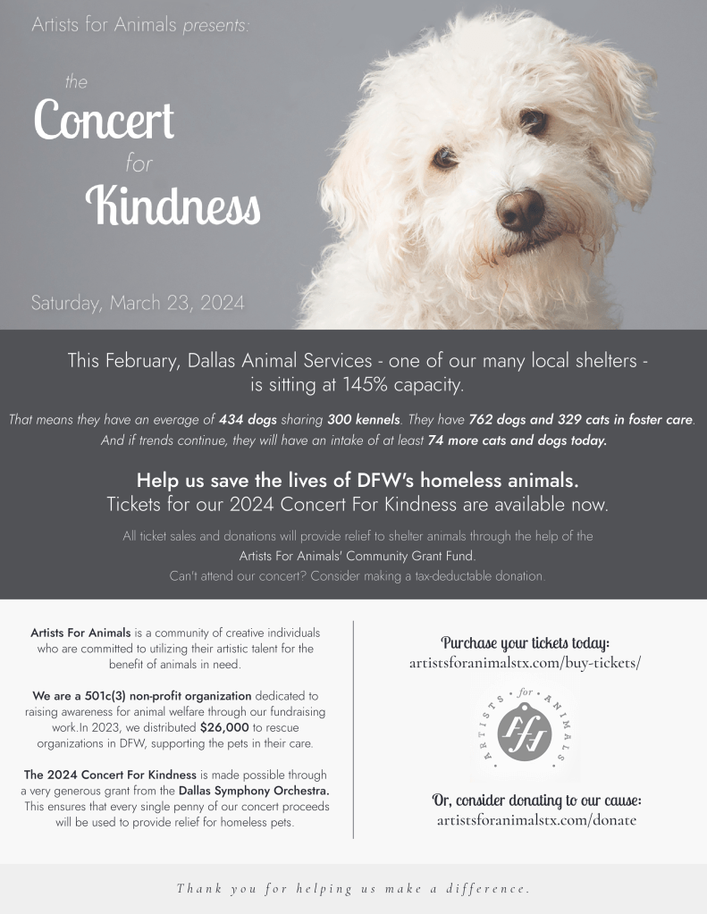 The Concert For Kindness will take place in the Meyerson lobby at 3PM on Sunday April 23. Tickets are available now, and all proceeds and donations will go directly our Community Grant Fund. Help us provide food, shelter, and life-saving veterinary care for animals in need. We hope you can join us!